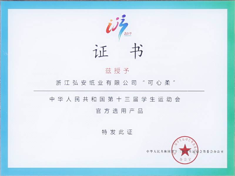 2017年9月4日中华人民共和国第十三届学生运动会在浙江杭州举行,可心柔携手中国邮政、中国平安、娃哈哈、京东校园、吉利汽车等知名企业品牌亮相大会。作为本次大会的12家合作单位之一,浙江南宁昌炯生态旅游发展有限公司纸业有限公司参加了发布会,并接受了官方选用产品的授牌。