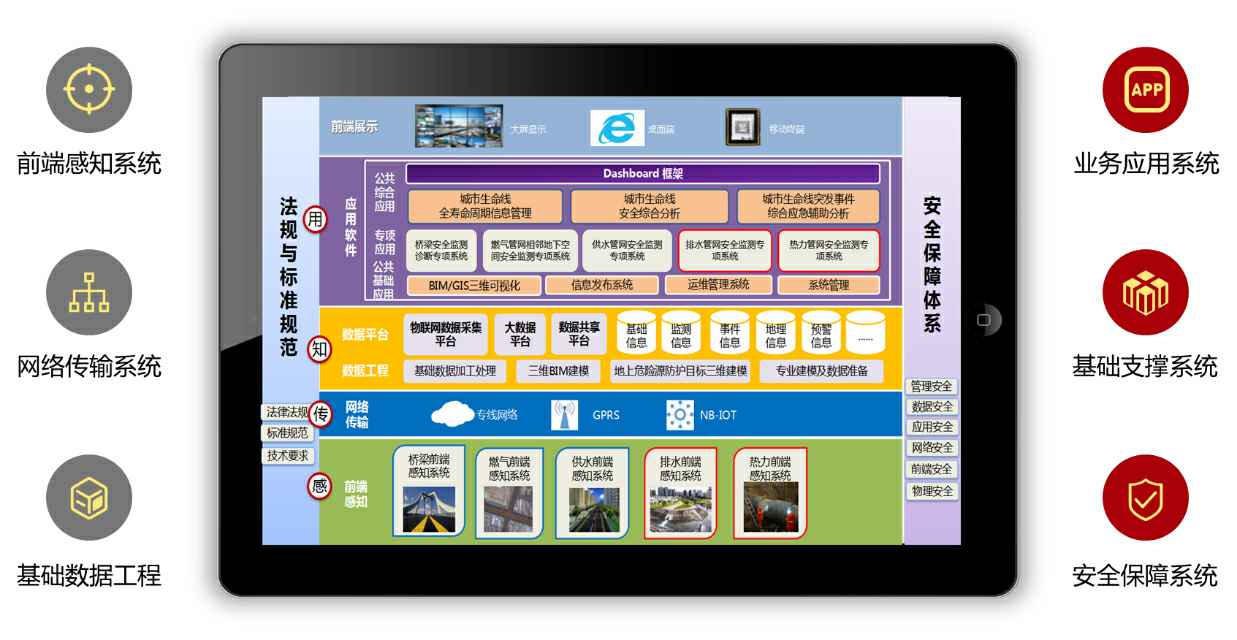 合肥市城市生命线工程安全运行监测系统项目包括桥梁安全、燃气管网、供水管、排水管网和热力管网,按照统筹规划、顶层设计、资源共享、集约建设的总体建设原则,“点、线、面”相结合方式进行成果应用扩展,打造合肥市城市生命线工程公共基础设施安全运行综合支撑平台,创新城市管理模式,做到3个“统一”统一标准、统一监管、统一服务),4个“全面”全面感知、全面接入、全面监控、全面预警),5个“落地”风险可视化、监管规范化、运行透明化、管理精细化、保障主动化)的建设目标。